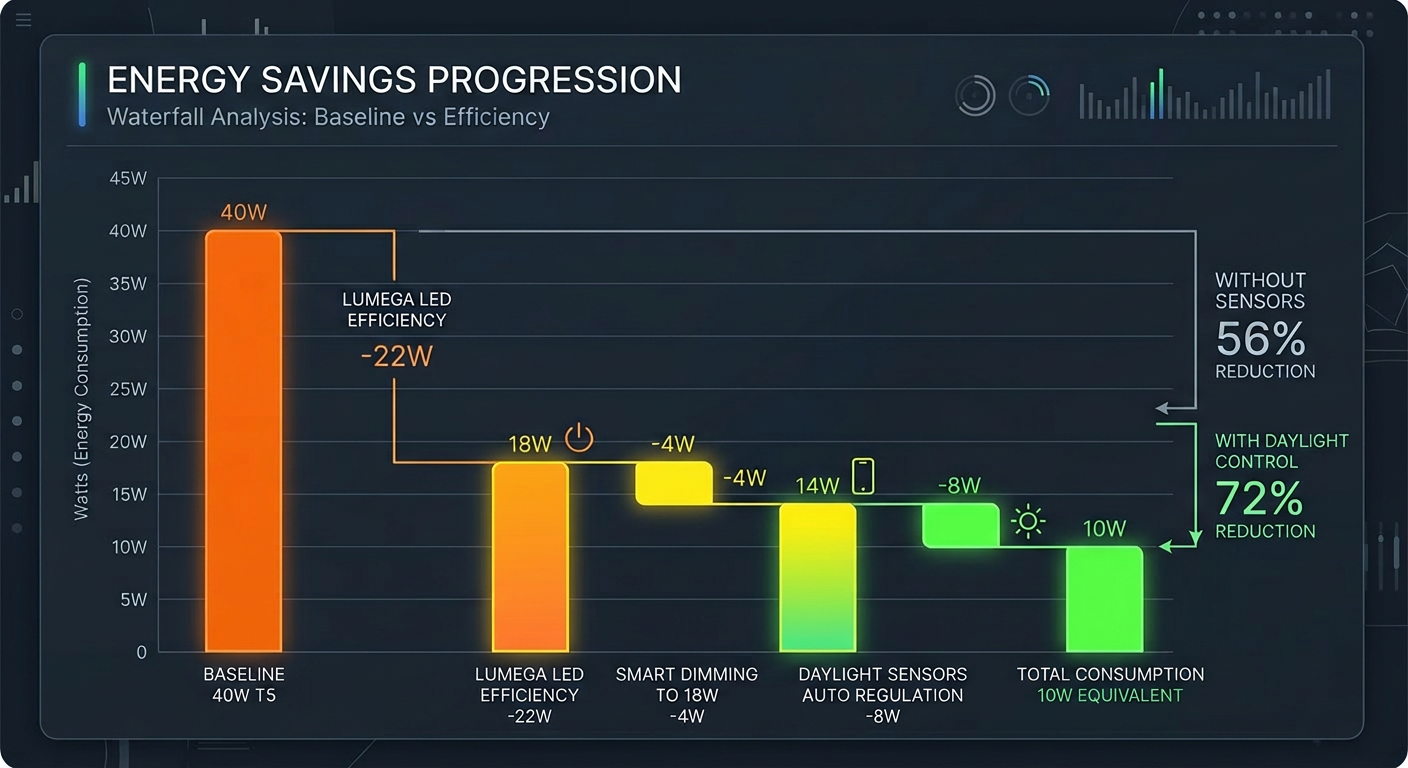 Den nye løsningen reduserte energiforbruket fra 40 W til 18 W per armatur – en besparelse på 56 %, som øker til hele 72 % med innebygde dagslyssensorer. Samtidig ble lysnivået betydelig økt fra 105 lux til 855 lux, før det ble justert ned til 250 lux for optimal komfort og energiforbruk. Systemet ble koblet til Casambi, som muliggjør intelligent styring av lyset via smarttelefon og nettbrett – uten behov for ekstra kabling.